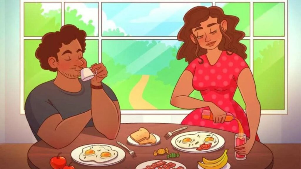 In the above image, you have to spot two mistakes hidden inside the picture where a couple is having breakfast at the table. The man is drinking tea and the woman is drinking juice with eggs and fruits. But were you able to identify the mistake in the picture?